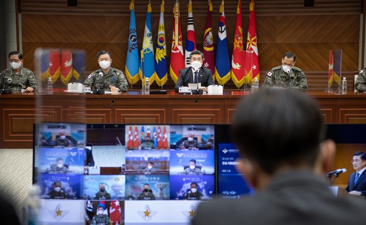 [서울=뉴시스] 서욱 국방부 장관이 28일 서울 용산구 국방부에서 열린 주요 지휘관회의를 주재하고 있다. (사진=국방부 제공) 2022.02.28. photo@newsis.com *재판매 및 DB 금지 |