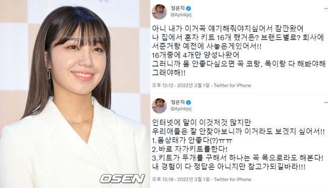 이어 "그러니까 몸 안좋다싶으면 꼭 코랑, 목이랑 다 해봐야해 그래야해!!"라고 조언했다. 정은지는 "인터넷에 말이 이것저것 많지만 우리애들은 잘 안찾아보니까 이거라도 보겠지 싶어서!! 몸상태가 안좋다, 바로 자가키트를한다! 키트 두개를 구해서 하나는 꼭 목으로라도 해본다! 내 경험이 다 정답은 아니지만 참고가되길바라!!!"라고 덧붙였다.