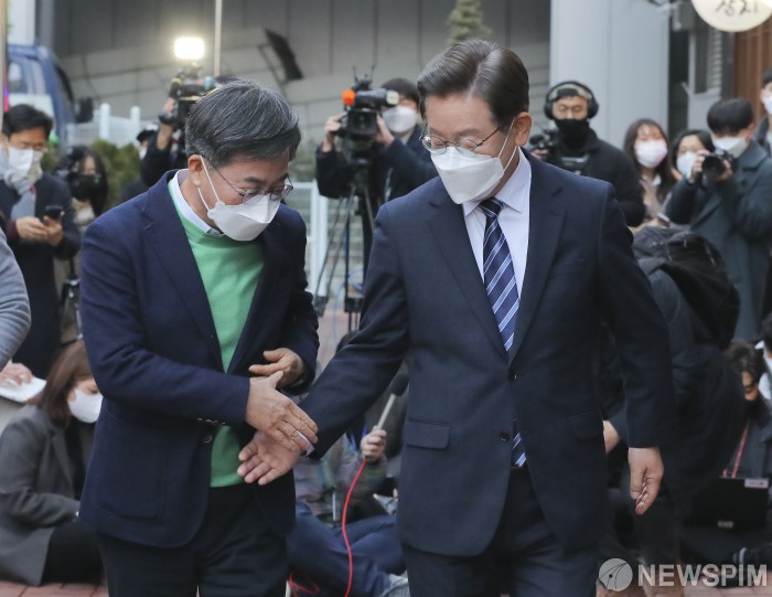 [서울=뉴스핌] 김학선 기자 = 이재명 더불어민주당 대선후보와 김동연 새로운물결 대선후보가 지난 1일 오후 서울 마포구의 한 카페에서 회동을 갖고 통합정부 구성에 합의했다. 2022.03.01 yooksa@newspim.com |