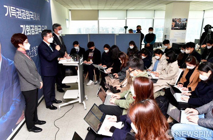 [서울=뉴스핌] 이형석 기자 = 김동연 새로운물결 대선 후보가 2일 서울 영등포구 선거 캠프에서 기자회견을 열고 후보 사퇴 및 이재명 더불어민주당 후보의 지지 의사를 밝히고 있다. 2022.03.02 leehs@newspim.com