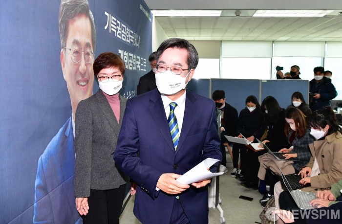 [서울=뉴스핌] 이형석 기자 = 김동연 새로운물결 대선 후보가 2일 서울 영등포구 선거 캠프에서 기자회견을 열고 후보 사퇴 및 이재명 더불어민주당 후보의 지지 의사를 밝힌 뒤 나서고 있다. 2022.03.02 leehs@newspim.com