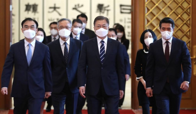 [서울=뉴시스] 전진환 기자 = 문재인 대통령이 4일 오후 신임 대사 신임장 수여를 위해 청와대 본관 충무실로 입장하고 있다. 2022.03.04. |