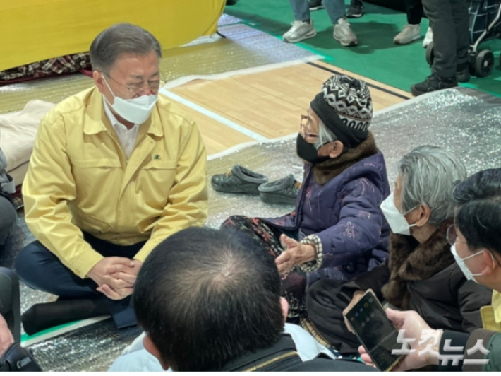 문재인 대통령이 6일 울진 국민체육센터에 마련된 이재민 대피소를 찾아 이재민을 위로하고 있다. 독자 제공 |