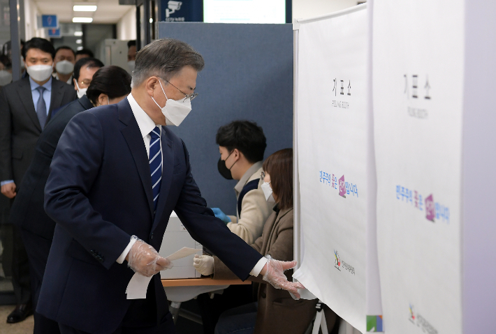 문재인 대통령이 4일 오전 서울 종로구 삼청동 주민센터에 마련된 제20대 대통령선거 사전투표소에서 대통령 선거 및 국회의원 재보궐선거 투표용지를 들고 기표소로 들어가고 있다. 연합뉴스 |