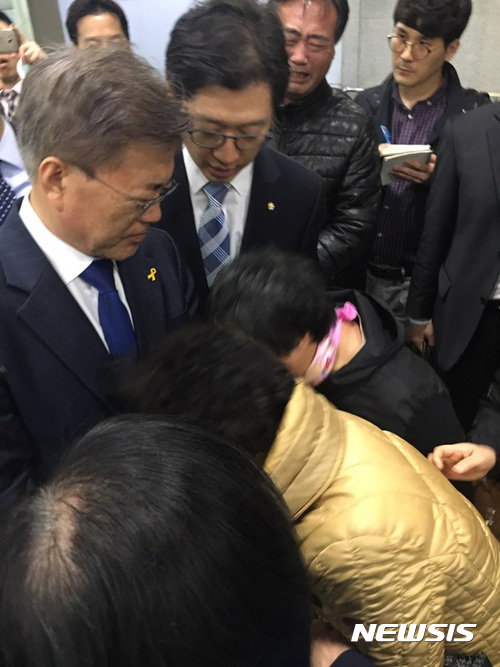 【서울=뉴시스】임재희 기자 =2017년4월17일 문재인 당시 더불어민주당 대선후보가 수원 유세를 마치고 서울 용산역에 도착해 광화문 광장 집중유세 현장으로 향하던 중 스텔라데이지호 실종자 가족들을 만나게 되어 가족들을 위로하고 있다. 2017.04.17. |
