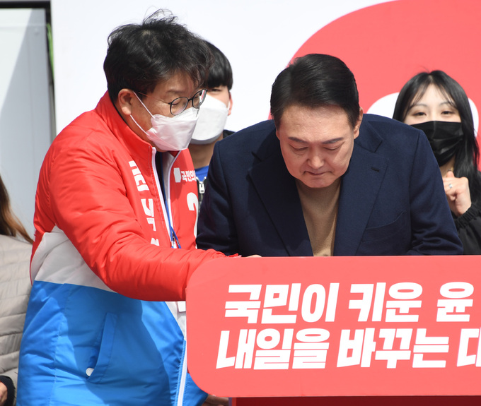 윤석열 대통령 당선인과 국민의힘 권성동 의원. 동해=연합뉴스 |
