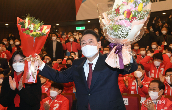 윤석열 대통령 당선인이 10일 새벽 국회 도서관에 마련된 국민의힘 개표상황실을 찾아 당선 축하 꽃다발을 받아 들고 있다. / 이병화 기자 |