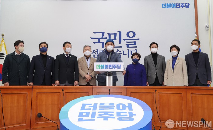 [서울=뉴스핌] 이형석 기자 = 송영길 더불어민주당 대표를 비롯한 지도부가 10일 서울 여의도 국회에서 대선패배에 책임으로 사퇴를 밝히는 기자회견을 하고 있다. 2022.03.10 leehs@newspim.com