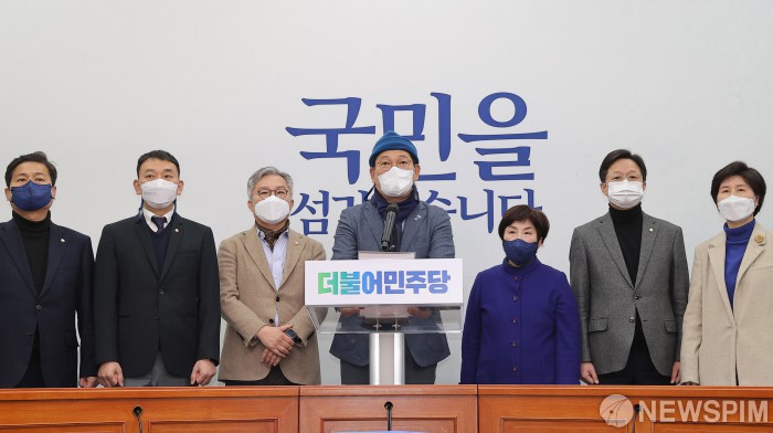 [서울=뉴스핌] 이형석 기자 = 송영길 더불어민주당 대표를 비롯한 지도부가 10일 서울 여의도 국회에서 대선패배에 책임으로 사퇴를 밝히는 기자회견을 하고 있다. 2022.03.10 leehs@newspim.com