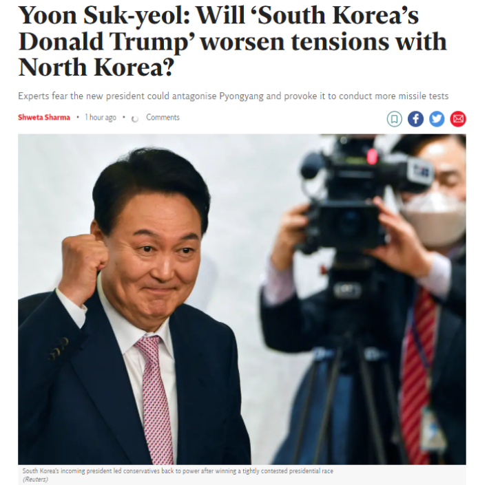 영국 일간 인디펜던트는 10일(현지시간) '윤석열: 남한의 트럼프, 북한과의 긴장 악화시킬까?'라는 제목의 전망기사를 실었다.