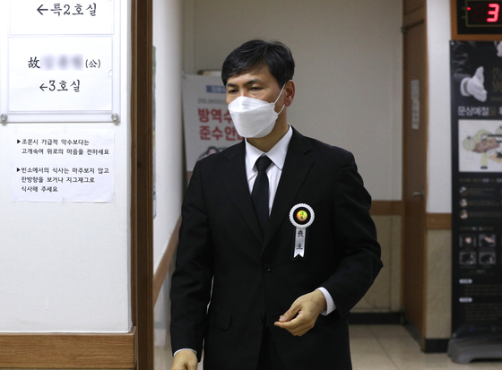 [서울=뉴시스] 추상철 기자 = 부친상으로 일시 석방된 안희정 전 충남지사가 9일 오후 서울의 한 장례식장에서 조문객을 맞이하고 있다. 2022.03.09. |