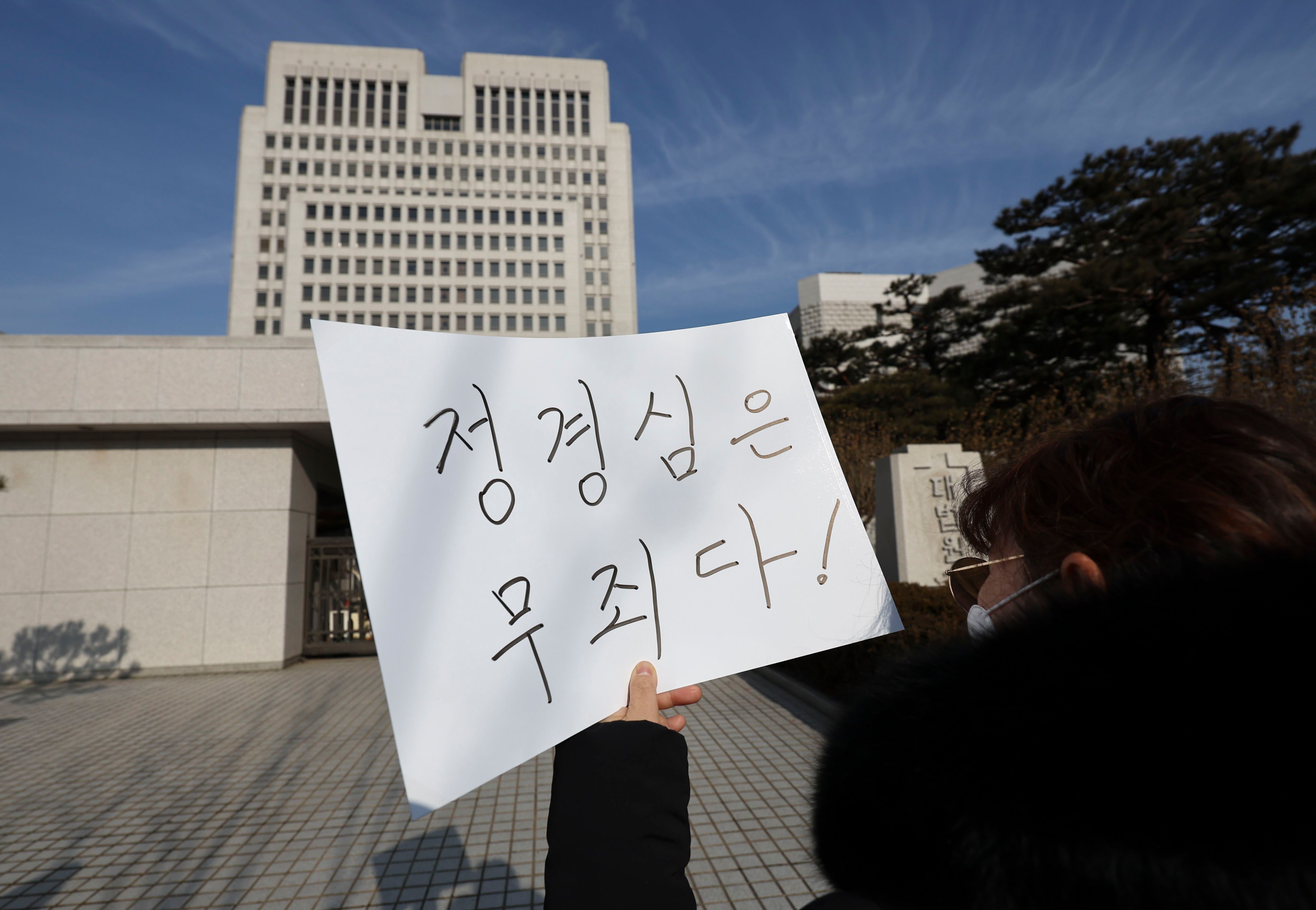 지난 1월 27일 오전 서울 서초구 대법원 앞에서 조국 전 법무장관 아내인 정경심 전 동양대 교수 지지자들이 무죄를 주장하는 피켓을 들고 있다. /연합뉴스 |