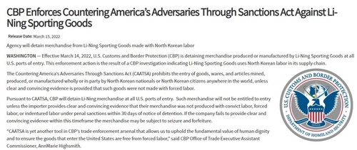 미국 세관국경보호국(CBP)은 지난 15일(현지시간) 홈페이지를 통해 "14일부터 미국의 모든 항구에서 리닝이 제조하거나 생산한 상품을 압류한다"며 "이는 리닝이 북한의 노동력을 공급망에서 활용했음을 나타내는 CBP의 조사 결과에 따른 것"이라고 밝혔다.