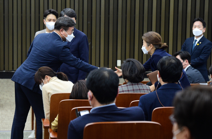 윤 위원장은 이날 국회에서 초·재선 의원들과 비공개 간담회를 잇달아 열고 비대위 체제에 대한 의견을 청취했다. 윤 위원장이 사퇴해야 한다는 의견과 6월 지방선거를 목전에 둔 상황에서 윤호중 체제는 불가피하다는 주장이 맞섰다.