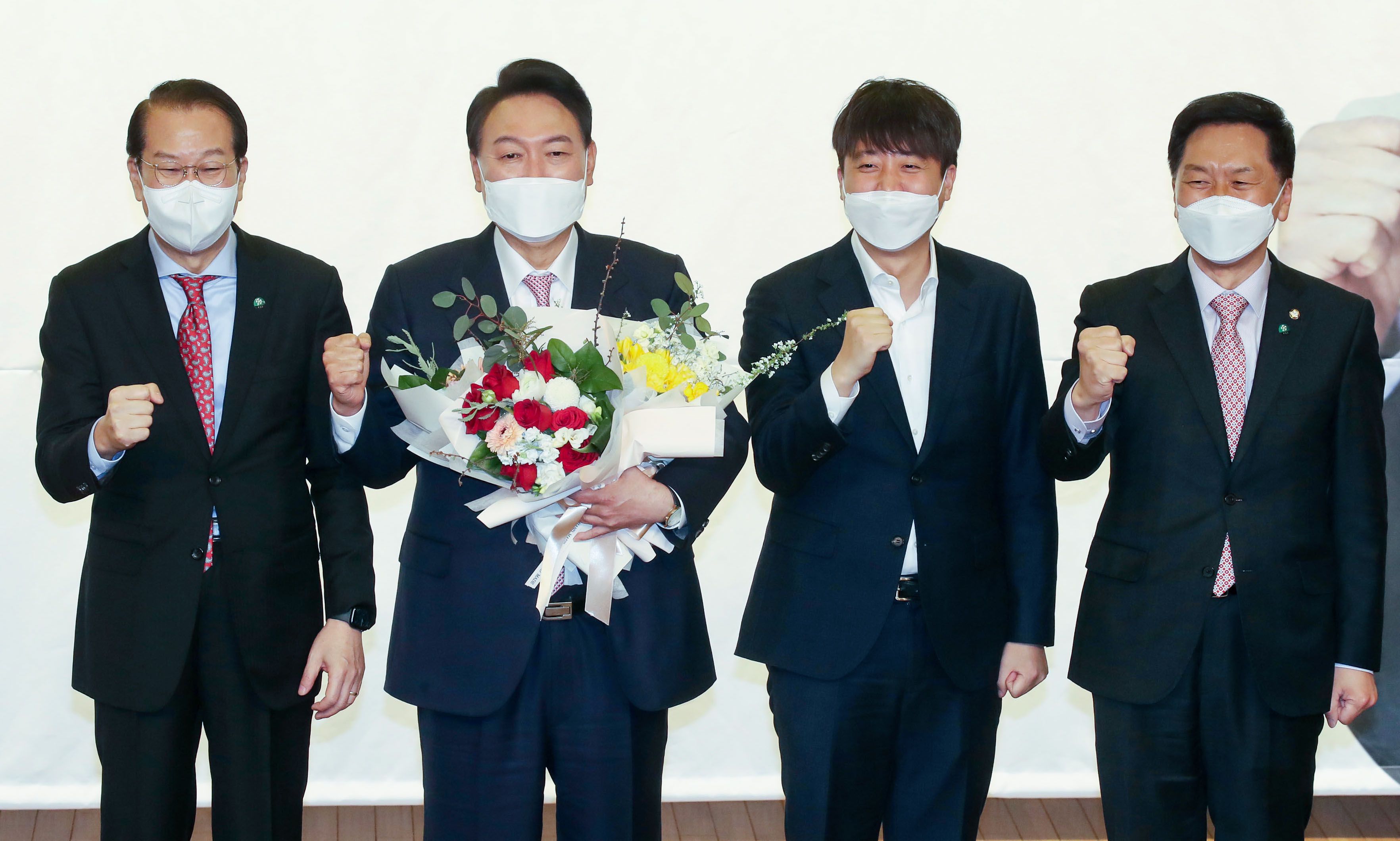 윤석열 대통령 당선인이 10일 국회 도서관에서 열린 국민의힘 선대위 해단식에서 이준석 당 대표를 비롯한 당 지도부와기념촬영을 하고 있다./국회사진기자단 |