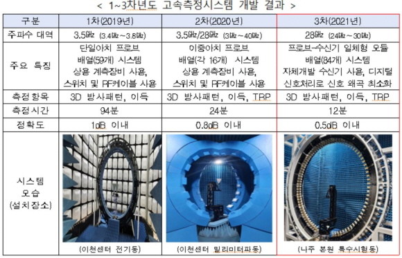 기존에 이용하던 소형 안테나 시험시설은 5G 단말기 측정에 200시간 정도 소요됐으나 이번 시스템 개발로12분 내외로 가능해졌다는 설명이다.