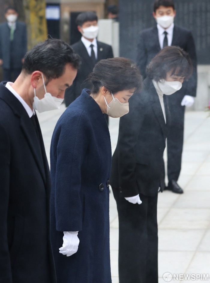 [서울=뉴스핌] 황준선 기자 = 박근혜 전 대통령이 24일 오전 서울 동작구 국립서울현충원에서 부친인 박정희 전 대통령 묘역을 찾아 참배하고 있다. 2022.03.24 hwang@newspim.com