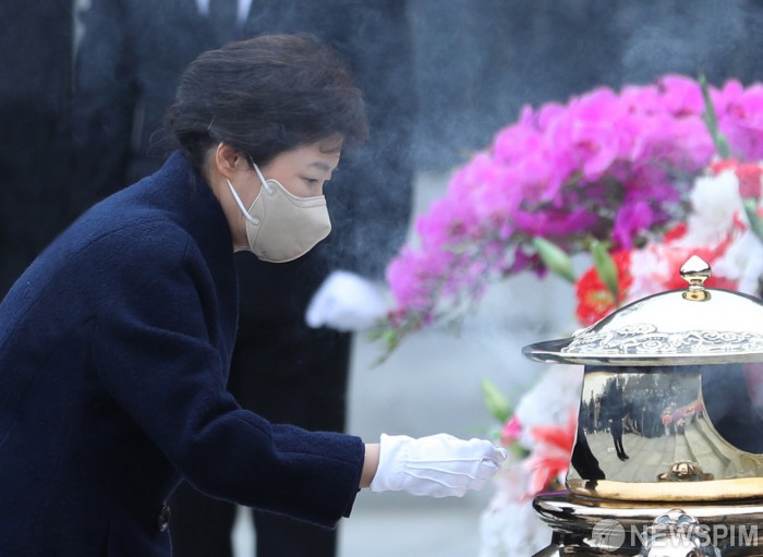 [서울=뉴스핌] 황준선 기자 = 박근혜 전 대통령이 24일 오전 서울 동작구 국립서울현충원에서 부친인 박정희 전 대통령 묘역을 찾아 참배하고 있다. 2022.03.24 hwang@newspim.com