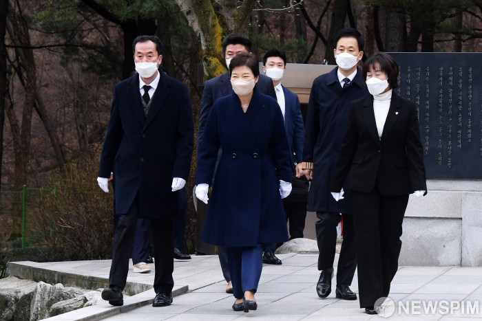[서울=뉴스핌] 황준선 기자 = 박근혜 전 대통령이 24일 오전 서울 동작구 국립서울현충원에서 부친인 박정희 전 대통령 묘역을 찾아 참배하기 위해 이동하고 있다. 2022.03.24 hwang@newspim.com