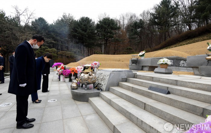 [서울=뉴스핌] 황준선 기자 = 박근혜 전 대통령이 24일 오전 서울 동작구 국립서울현충원에서 부친인 박정희 전 대통령 묘역을 찾아 참배하고 있다. 2022.03.24 hwang@newspim.com