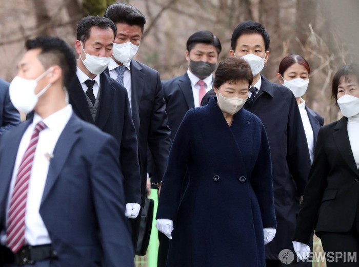[서울=뉴스핌] 황준선 기자 = 박근혜 전 대통령이 24일 오전 서울 동작구 국립서울현충원에서 부친인 박정희 전 대통령 묘역을 찾아 참배를 마치고 이동하고 있다. 2022.03.24 hwang@newspim.com