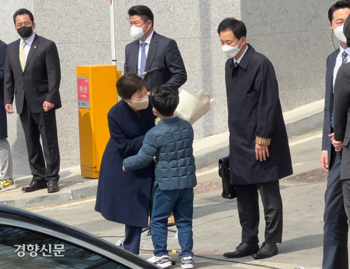 전직 대통령 박근혜씨가 24일 대구 달성 자신의 사저에 도착한 직후 한 어린이로부터 꽃다발을 건네받고 있다. 백경열 기자 |