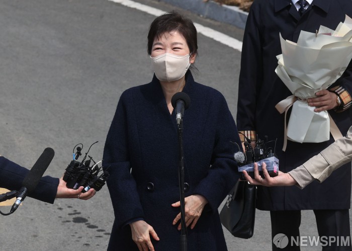 [대구=뉴스핌] 최상수 기자 = 박근혜 전 대통령이 24일 대구 달성군에 위치한 사저 앞에서 특별사면 삼성서울병원 퇴원 등에 대해 소회를 밝히고 있다. 2022.03.24 kilroy023@newspim.com