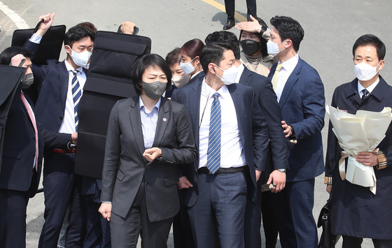 (대구=뉴스1) 공정식 기자 = 박근혜 전 대통령이 24일 오후 대구 달성군 유가읍 쌍계리 사저 앞에 도착해 차량에서 내려 대국민 메시지를 발표하는 도중 한 남성이 소주병 던지며 소동을 일으키자 경호원들의 경호를 받고 있다. 2022.3.24/뉴스1 |