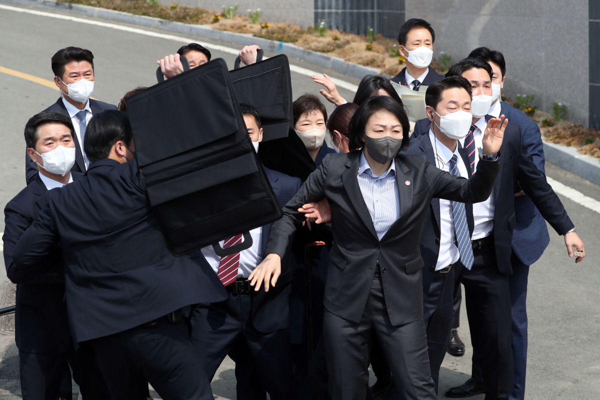 경호원들이 순식간에 박 전 대통령을 에워쌌으며, 소주병을 던진 40대 남성 A씨는 현장에서 경찰에 체포됐다.
