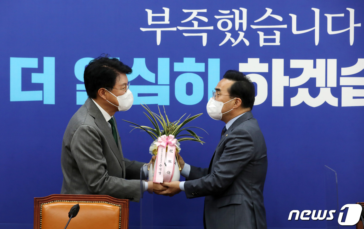 장제원 대통령 당선인 비서실장(왼쪽)이 25일 오전 서울 여의도 국회에서 박홍근 더불어민주당 신임 원내대표를 예방해 윤 당선인의 축하 난과 메시지를 전달하고 있다. 2022.3.25/뉴스1 © News1 이동해 기자 |