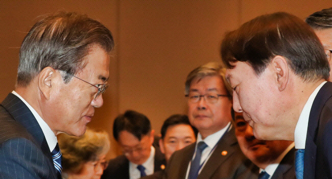 2019년 문재인 대통령과 윤석열 당시 검찰총장이 청와대에서 열린 반부패정책협의회에서 인사를 나누고 있다. 청와대 사진기자단 |