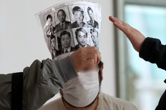 A씨는 이날 오전 영장실질심사에 참석하면서 인혁당 사건 피해자 8인의 얼굴이 인쇄된 종이를 비닐과 테이프 등으로 엮어 왕관처럼 머리에 쓰고 나타났다.