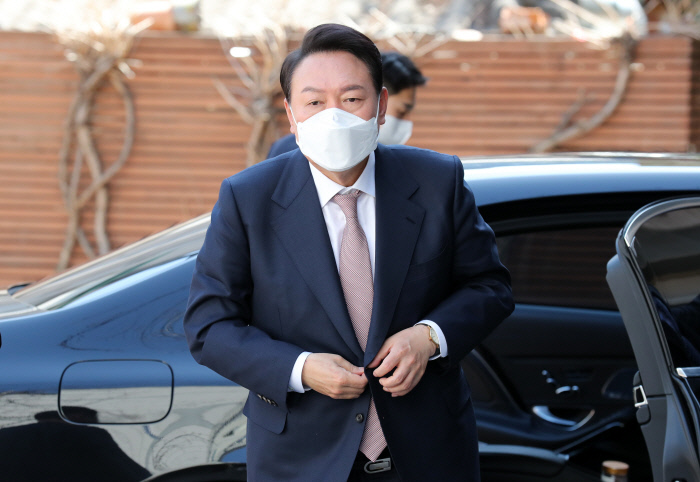 윤석열 대통령 당선인이 28일 서울 통의동 금융감독원 연수원에 마련된 인수위원회로 향하고 있다. 인수위사진기자단 |