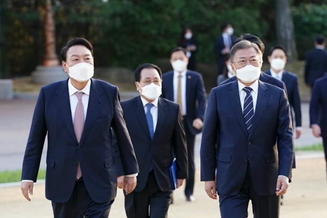 문 대통령과 윤 당선인은 청와대 마당인 녹지원을 가로질러 나란히 걸었다. 문 대통령이 안내했다. 만찬 회동 배석자인 유 비서실장과 장 비서실장이 따라 걸었다.