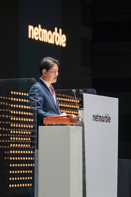 29일 서울 구로구 지타워컨벤션에서 열린 제11기 정기 주주총회에서 권영식 넷마블 대표가 인사말을 하고 있다. /넷마블 제공 |