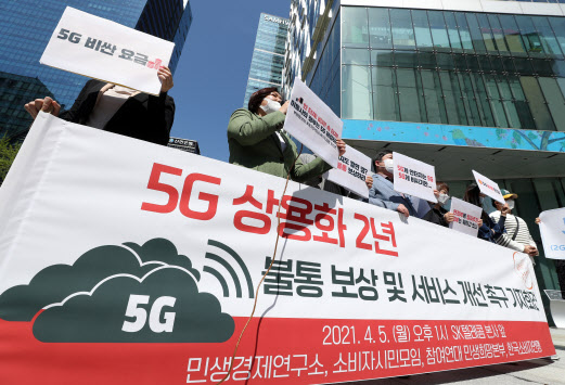 시민단체들이 지난해 4월 서울 종로구 SK텔레콤 본사 앞에서 기자회견을 열고 5G 불통 보상 및 서비스 개선을 촉구하고 있다. (사진 = 뉴시스) |