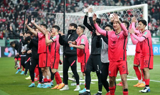 지난 24일 이란전을 2-0 완승으로 마친 뒤 만원 관중의 환호에 답례하는 축구대표팀. [뉴스1] |