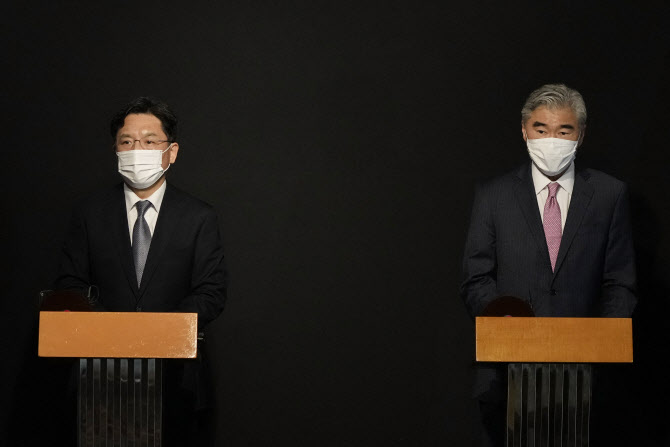 노규덕(왼쪽) 외교부 한반도평화교섭본부장과 성 김 미 국무부 대북특별대표. (사진= AFP) |