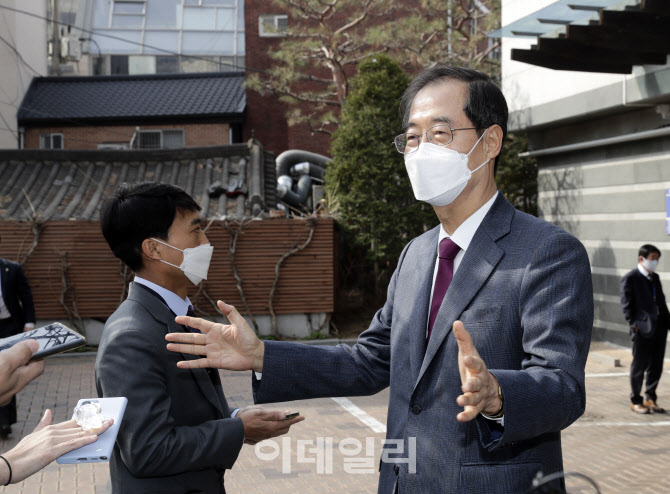 한덕수 국무총리 후보자가 5일 오전 서울 종로구 통의동 금융감독원 연수원에 마련된 대통령직인수위원회를 나서면서 기자들의 질문에 답변하고 있다. (사진=인수위사진기자단) |