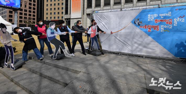 민주노총이 5일 서울 프레스센터 앞에서 2023년 적용 최저임금인상투쟁 선포 기자회견을 하고 있다.