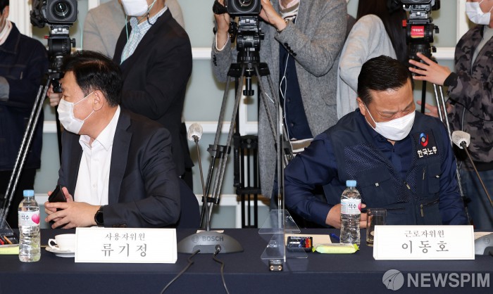 [서울=뉴스핌] 윤창빈 기자 = 최저임금위원회 근로자위원인 이동호 한국노총 사무총장(오른쪽)과 사용자위원인 한국경영자총협회 류기정 전무가 5일 오후 서울 중구 한국프레스센터에서 열린 최저임금위원회 올해 첫 전원회의에 참석해 인사하고 있다. 2022.04.05 pangbin@newspim.com