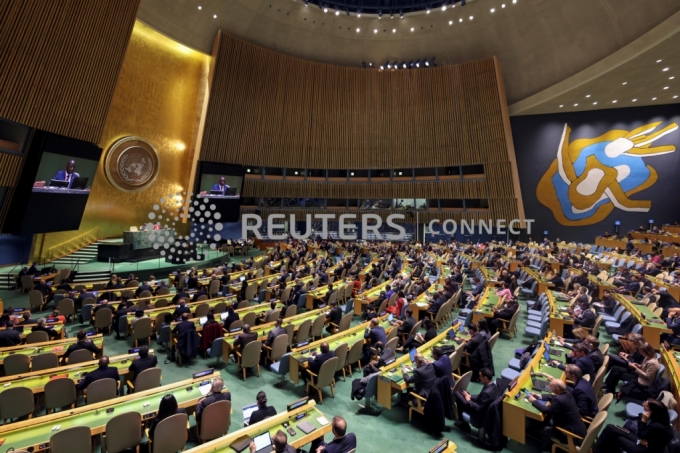 A general view of an emergency special session of the U.N. General Assembly on Russia's invasion of Ukraine, at the United Nations headquarters in New York City, New York, U.S. April 7, 2022. REUTERS/Andrew Kelly |