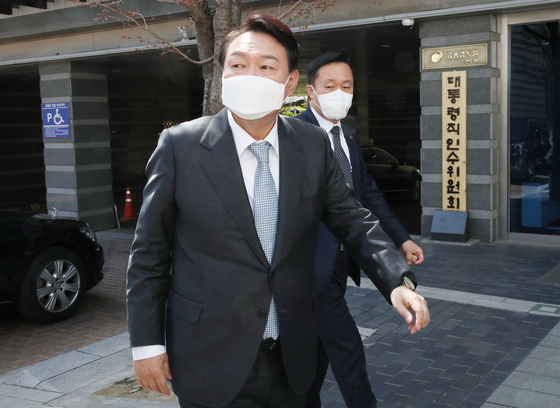 (서울=뉴스1) 인수위사진기자단 = 윤석열 대통령 당선인이 7일 한미연합사 방문 일정을 소화한 후 서울 종로구 통의동 인수위 집무실로 들어서고 있다. 2022.4.7/뉴스1 |