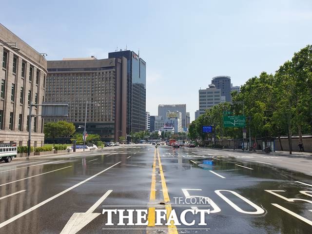 서울시가 도로 온도를 낮추고 미세먼지를 줄이기 위해 이달부터 10월까지 쿨링로드를 탄력적으로 운영한다고 밝혔다. 서울시청역 세종대로 앞에 설치된 쿨링로드 의 모습. /서울시 제공 |
