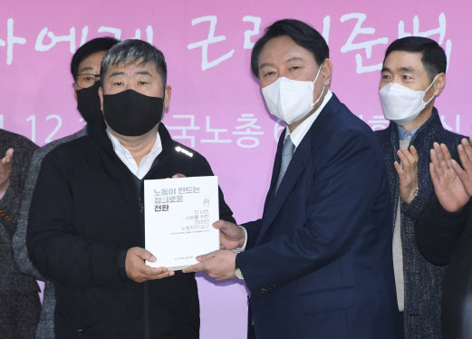 지난 12월 15일 국민의힘 윤석열 대선 후보가 서울 여의도 한국노총에서 정책간담회를 하기 전 김동명 위원장으로부터 노동자의 요구를 담은 책자를 전달받고 있다.(사진=연합뉴스) |