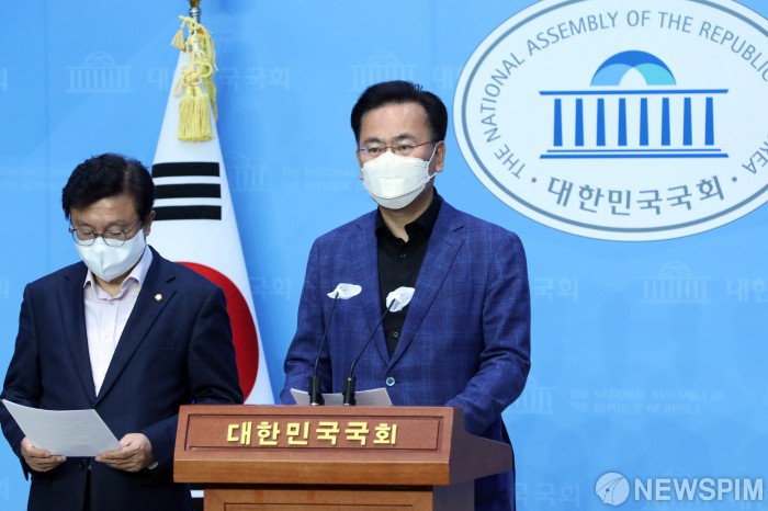 [서울=뉴스핌] 황준선 기자 = 유상범 국민의힘 법제사법위원회 간사(오른쪽)와 박형수 의원이 17일 오후 서울 여의도 국회 소통관에서 김오수 검찰총장 사퇴 관련 성명서를 발표하고 있다. 2022.04.17 hwang@newspim.com