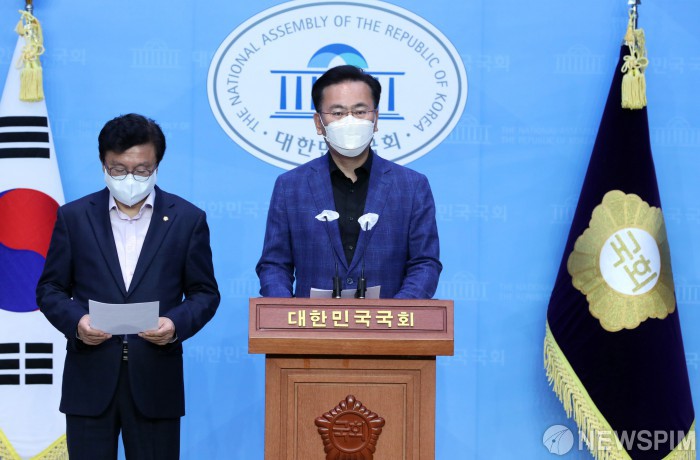 [서울=뉴스핌] 황준선 기자 = 유상범 국민의힘 법제사법위원회 간사(오른쪽)와 박형수 의원이 17일 오후 서울 여의도 국회 소통관에서 김오수 검찰총장 사퇴 관련 성명서를 발표하고 있다. 2022.04.17 hwang@newspim.com