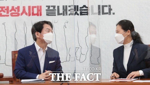 권은희(오른쪽) 국민의당 원내대표는 18일 서울 종로구 통의동 대통령직인수위원회 위원장실에서 열린 마지막 최고위원회의에서 국민의힘 합당 안건이 상정돼 의결됐다고 밝혔다. 왼쪽은 안철수 국민의당 대표. /남윤호 기자 |