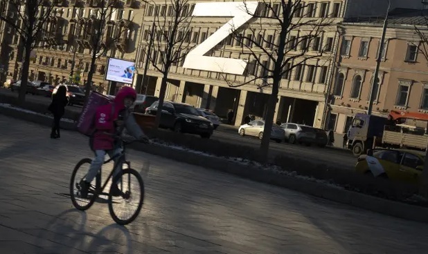 러시아 수도 모스크바에서 한 시민이 자전거를 타고 거리를 달리는 옆으로 초대형 ‘Z’ 글자가 보인다. Z는 러시아에서 우크라이나와의 전쟁을 지지하는 뜻으로 쓰인다. 모스크바=AP연합뉴스 |
