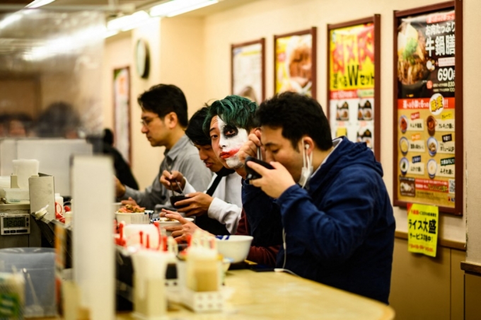 할로윈데이에 일본 덮밥집 요시노야에서 식사를 하는 손님들의 모습 /사진=AFP |